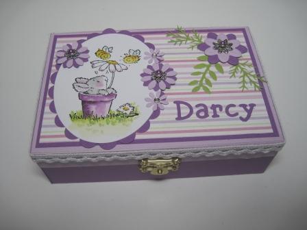 I made this card and altered box for my daughter's friend Darcy who has just turned 8. They are designed using the info I got from her which was she like pink and purple and her favourite animal is rabbits.